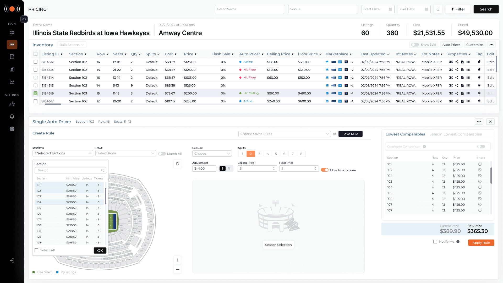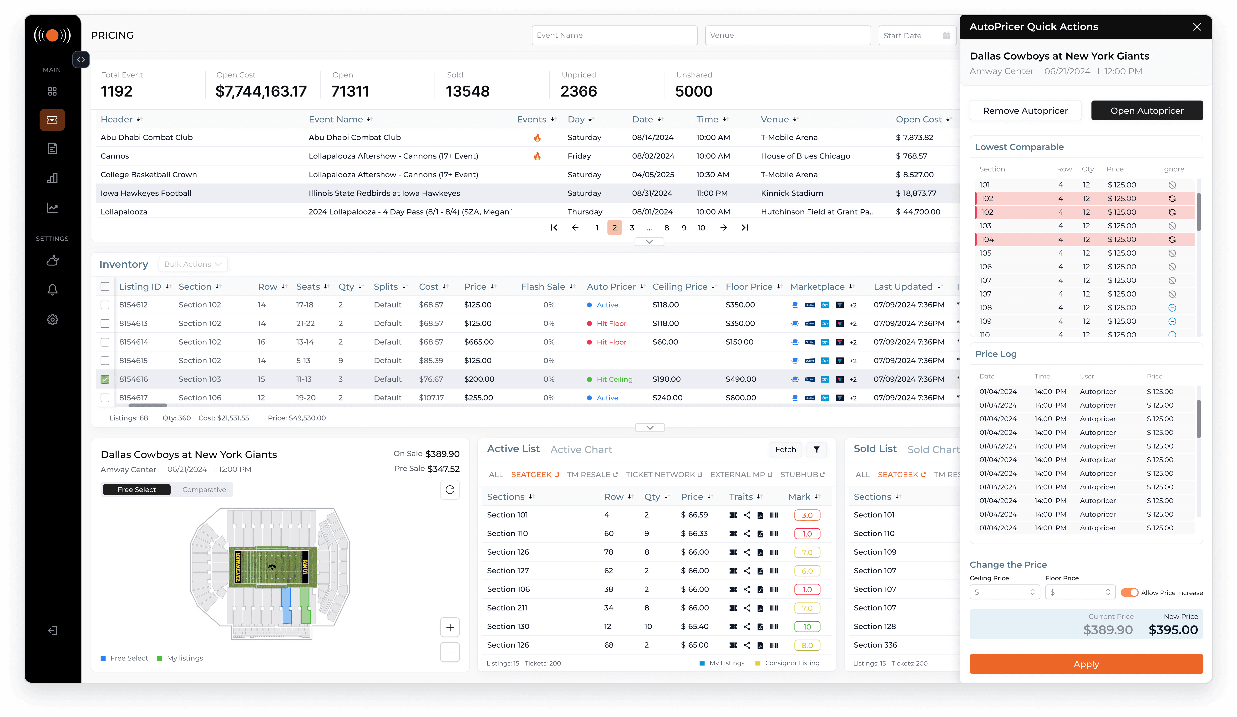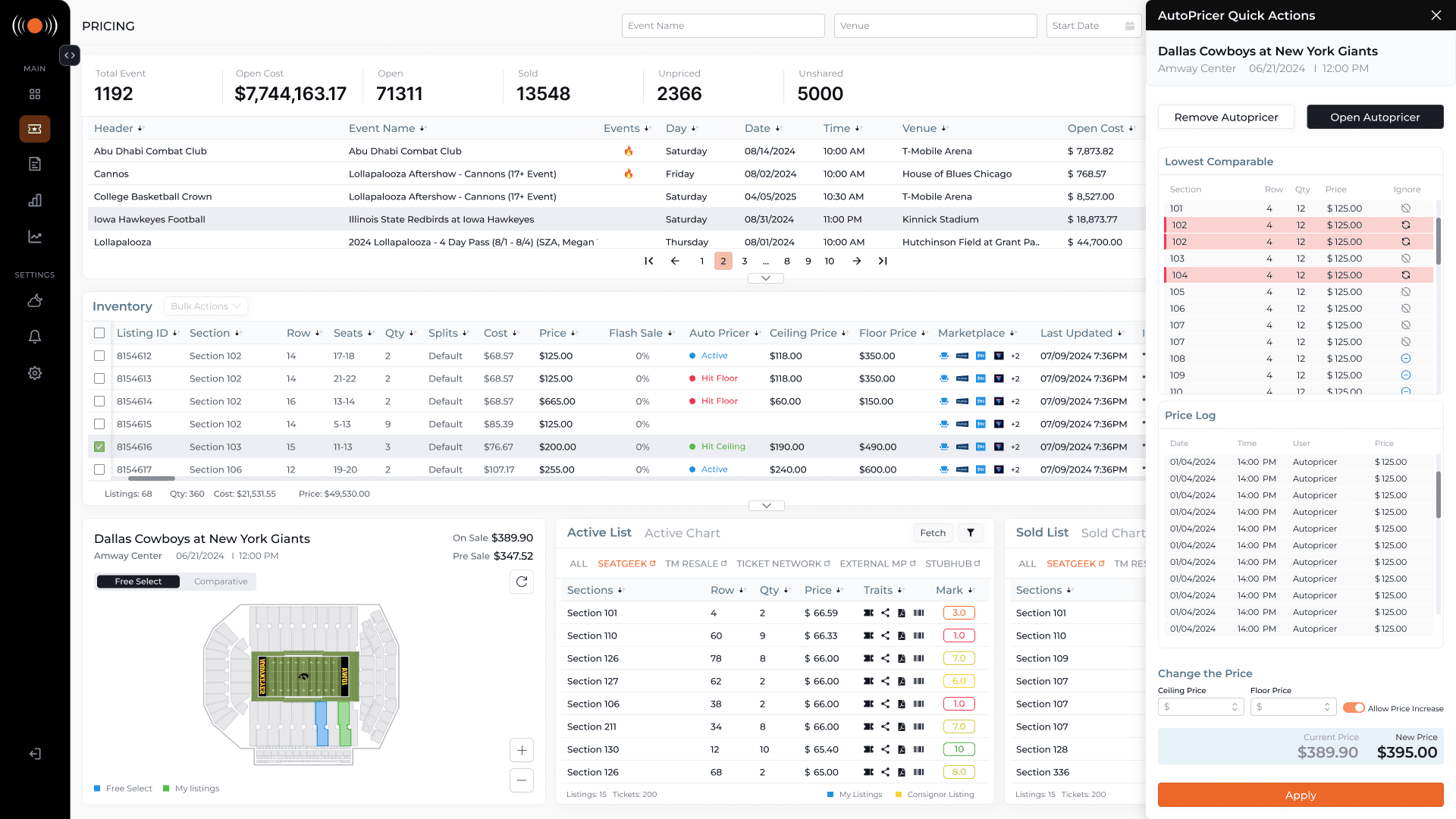 Open Autopricer, takes them into the full configuration flow, where they can set pricing rules, define price floors and ceilings, select sections using an integrated map, and see a live comparison between their current price and the new proposed