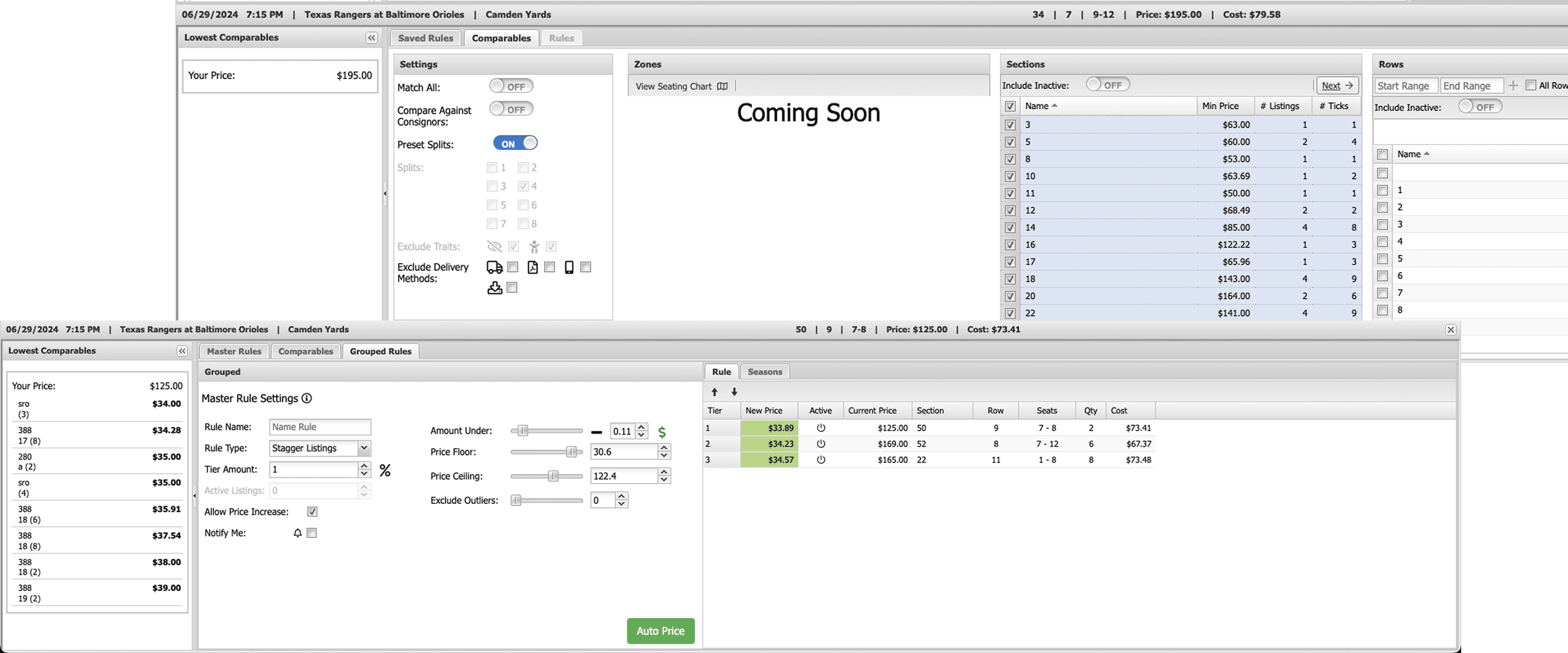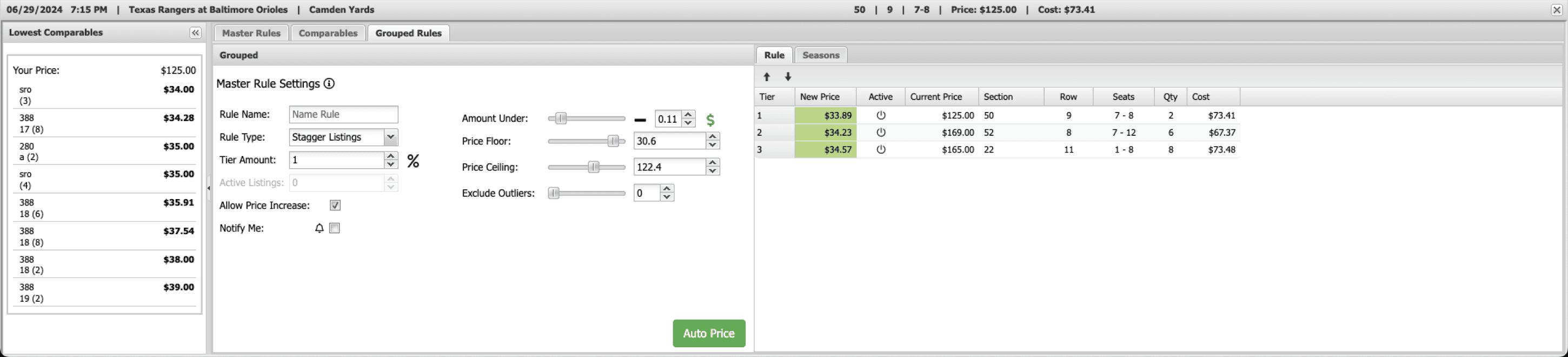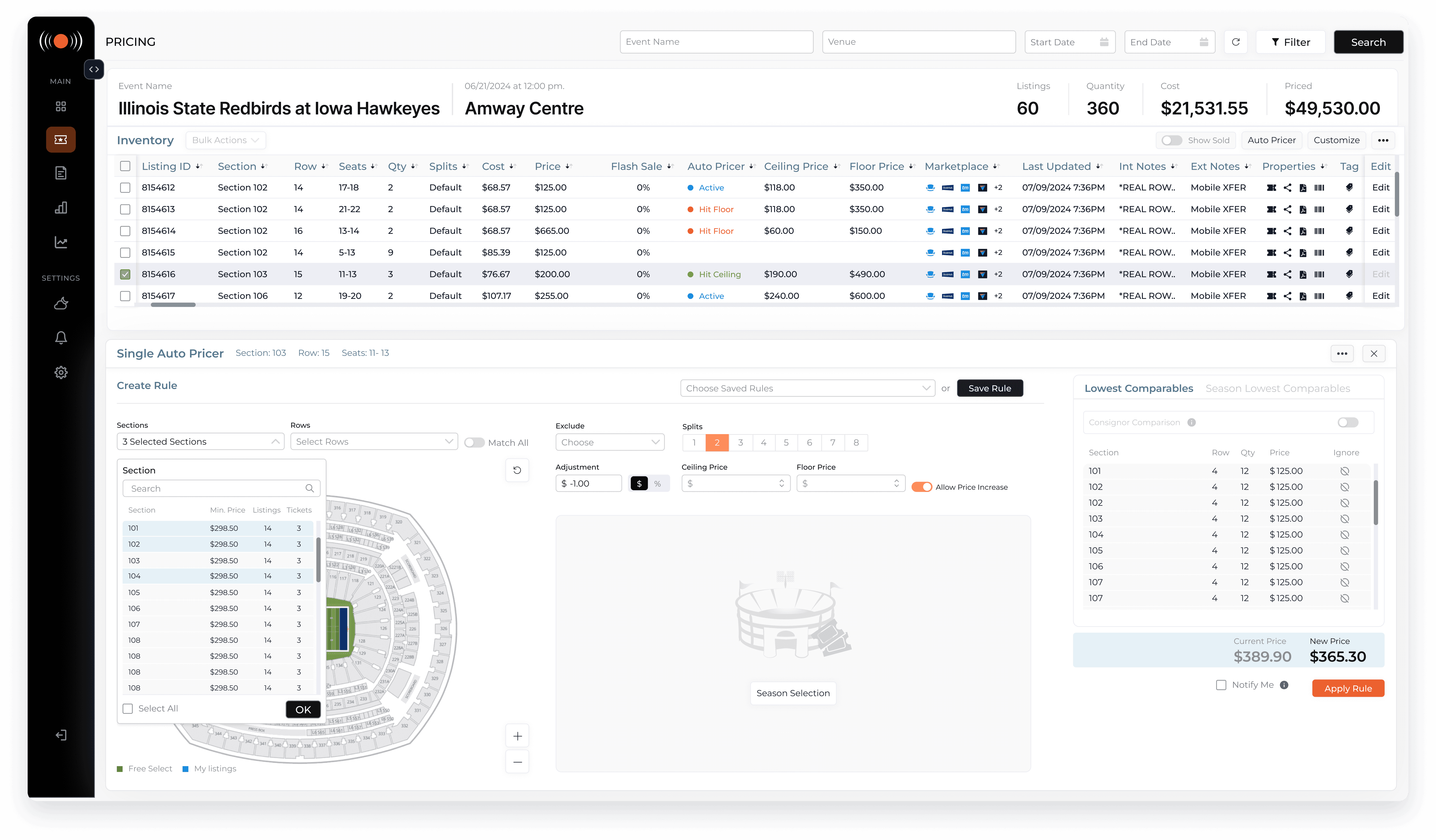 Open Autopricer, takes them into the full configuration flow, where they can set pricing rules, define price floors and ceilings, select sections using an integrated map, and see a live comparison between their current price and the new proposed