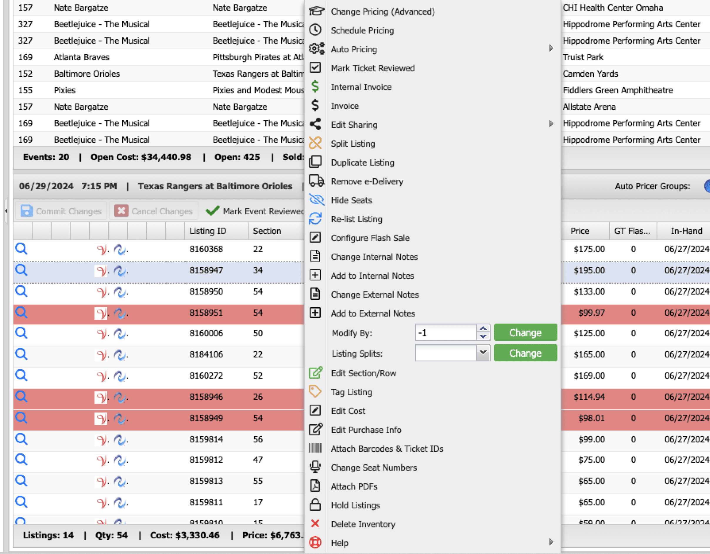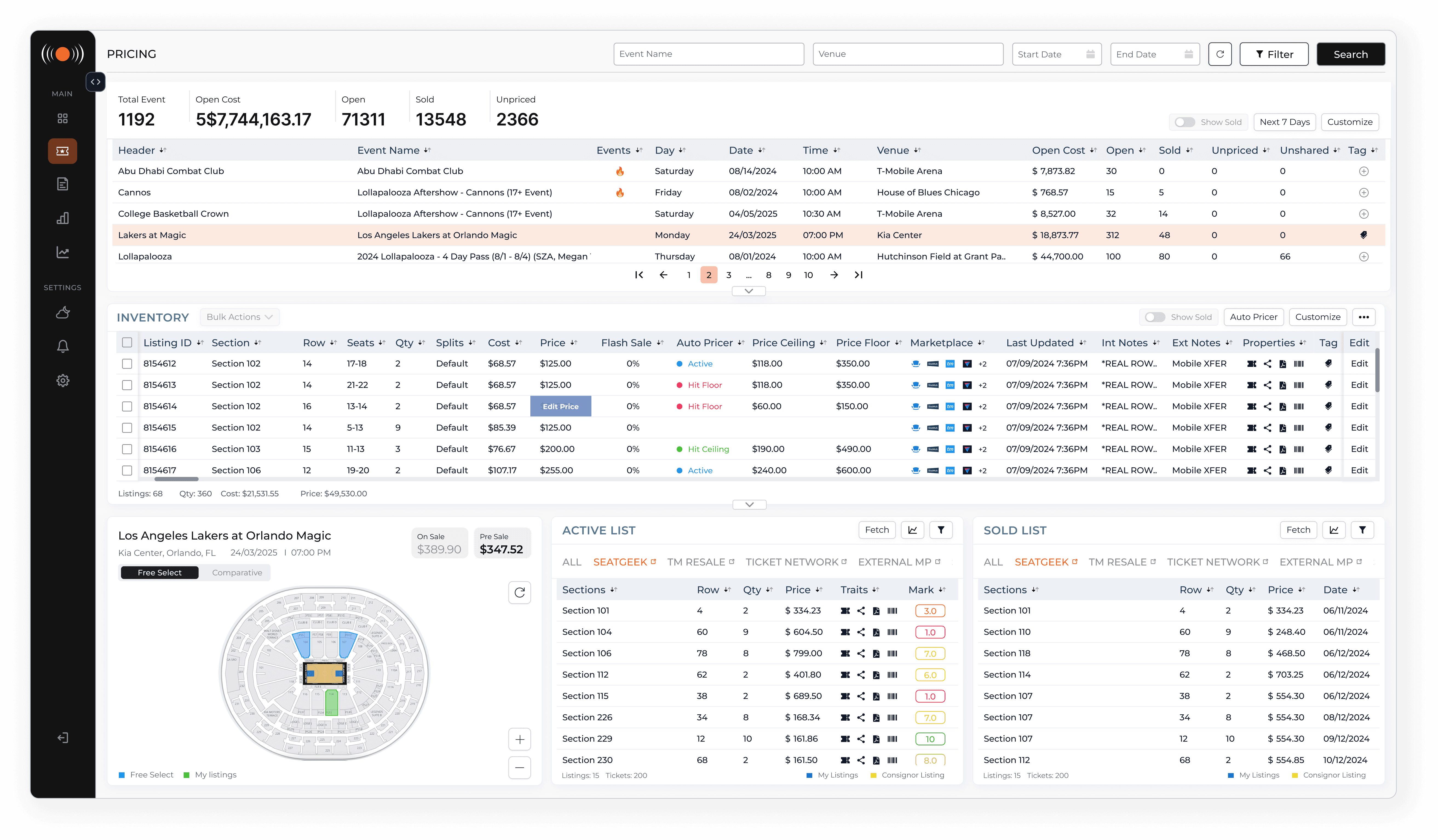 I restructured the entire page into three deliberate rows, each with a single job. Event selection at the top. Inventory management in the middle, duplicates removed, primary actions like Bulk Actions and Autopricer surfaced in the table header, and an Edit button on every row replacing hidden right-click interactions.
